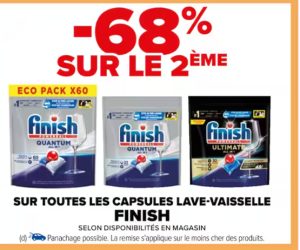 Pour l’achat d’un deuxième produit dans la gamme de capsules lave-vaisselle Finish, profitez d’une remise immédiate de -68% chez Carrefour.