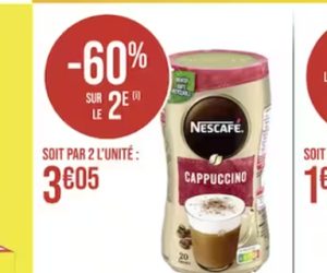 Pour l’achat d’un deuxième capuccino soluble Nescafé, profitez d’une remise immédiate de -60% chez Géant Casino.