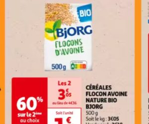 Achetez un deuxième Céréales flocons d’avoine nature bio Bjorg et profitez d’une remise immédiate de -60% chez Auchan.