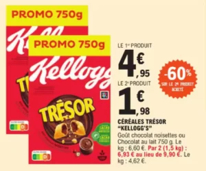 Pour l’achat d’un deuxième céréales Trésor Kellogg’s, profitez d’une remise immédiate de -60% chez E.Leclerc.