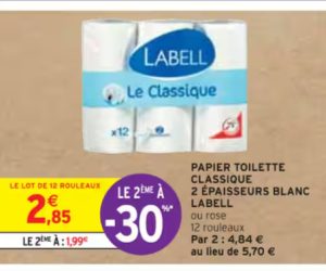 Pour l’achat d’un deuxième lot de papier toilette classique 2 épaisseur blanc Labell, profitez d’une remise immédiate de -30% chez Intermarché.