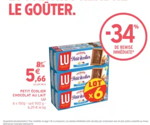 Bénéficiez d’une remise immédiate de -34% à l’achat d’un lot de petit écolier chocolat au lait LU chez Intermarché.