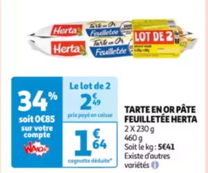 Bénéficiez d’un remboursement de 34% du prix sur votre carte de fidélité à l’achat d’une tarte en or pâte feuilletée Herta chez Auchan.